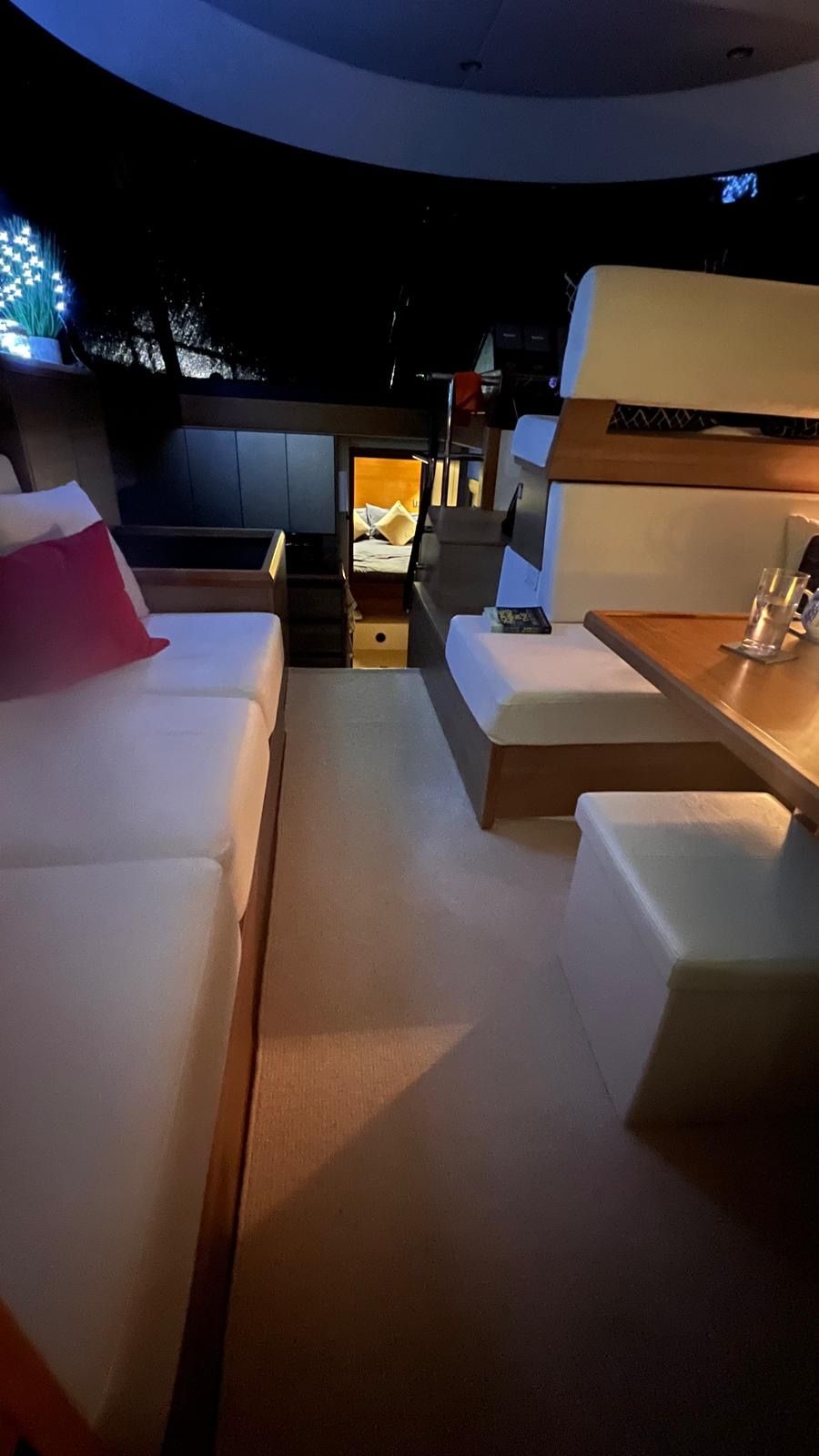 Elegant interior, bright modern saloon with large windows, luxury finishes, and a flexible layout that feels like a floating apartment. Complete with cream leather upholstery in saloon, with large L shaped seating on starboard side and double helm seat. Seating on port side and TV unit, with additional storage.
